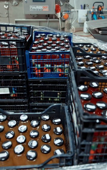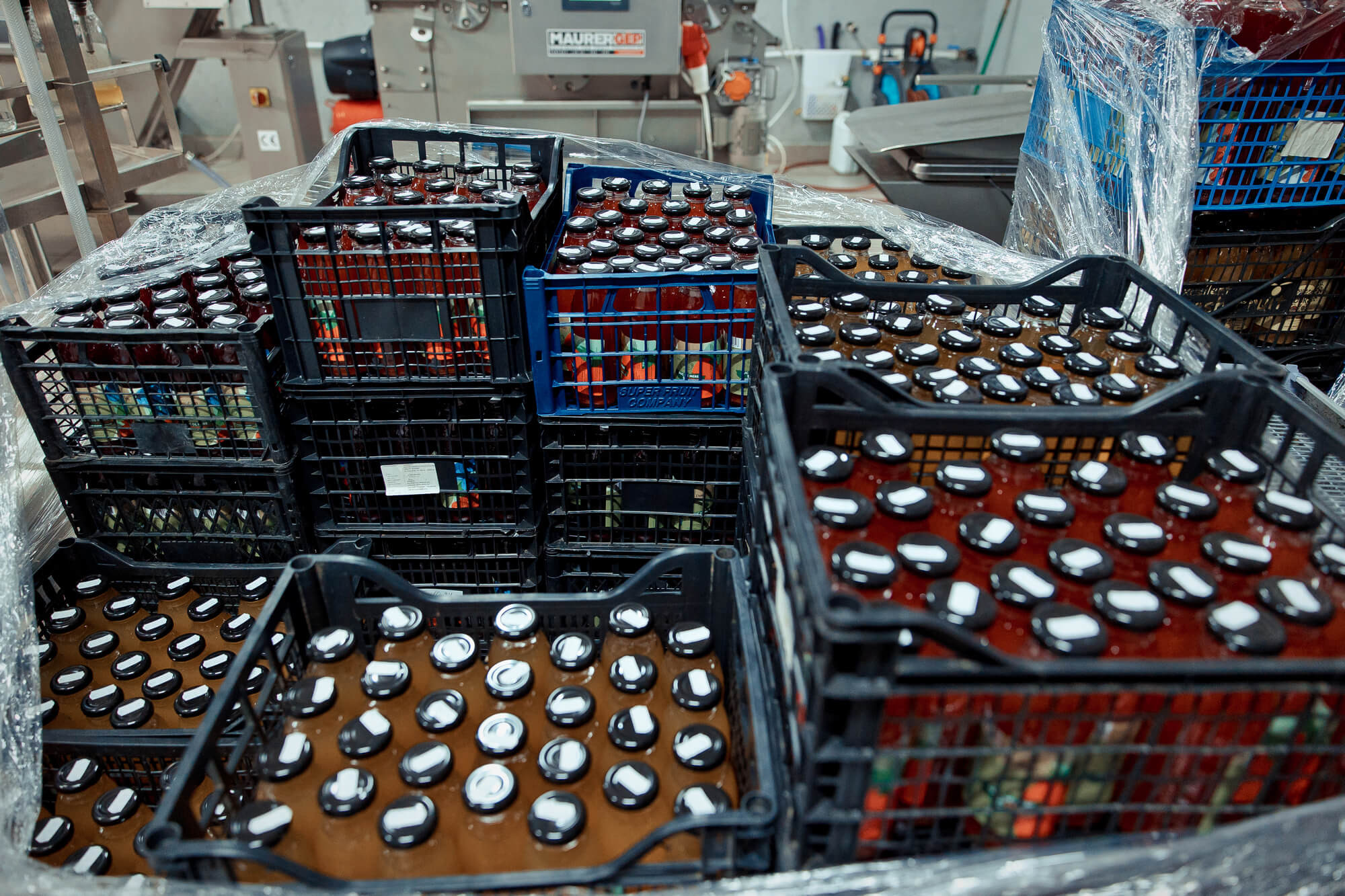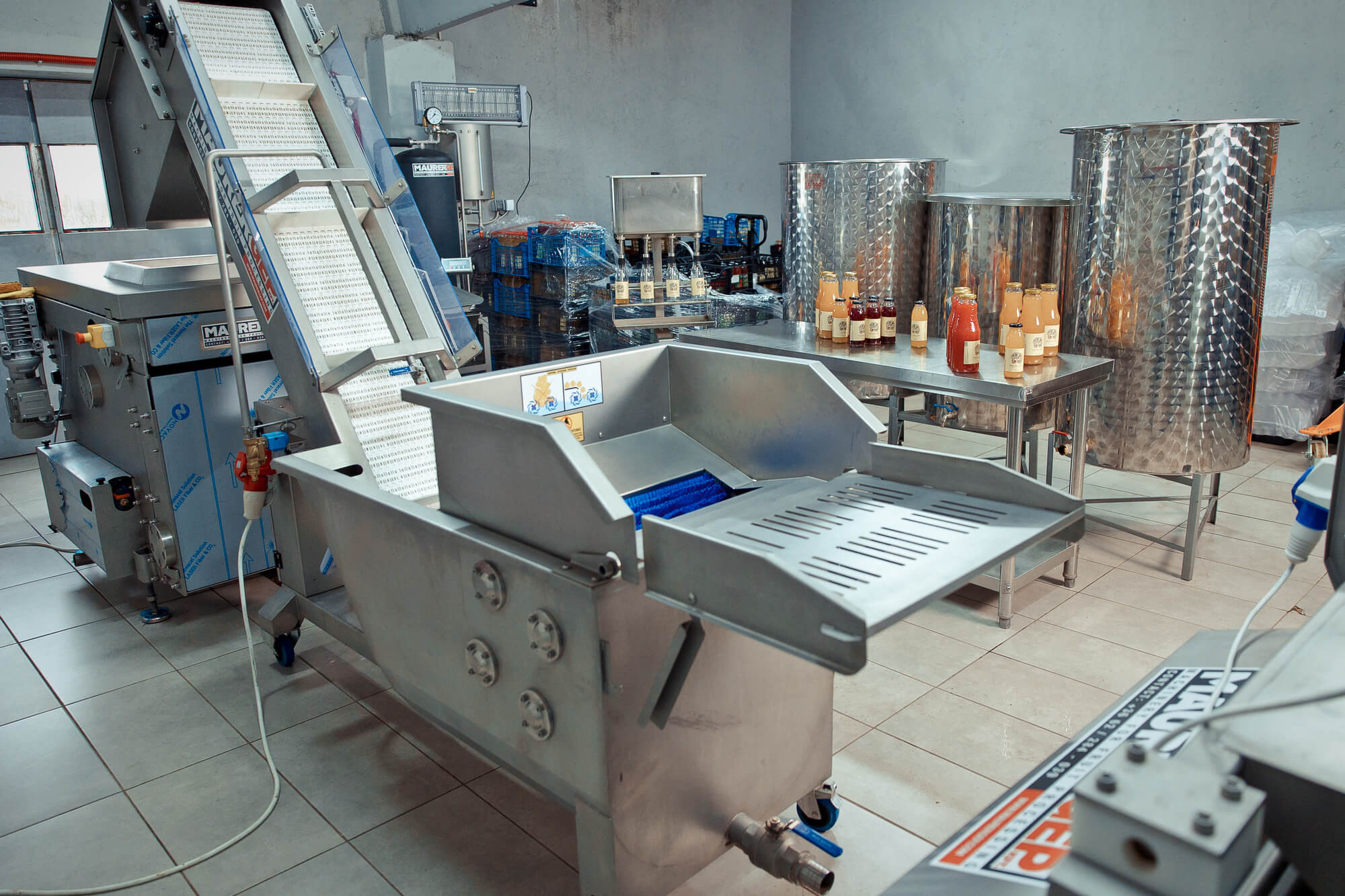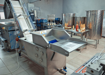 Echipamentele moderne au eficientizat întreg procesul de producere. După ce sunt descărcate, merele ajung în basculatorul de lăzi, care le răstoarnă automat. Urmează etapa de spălare și clătire, apoi merele sunt tocate și trimise în presa cu bandă, care extrage sucul. Hala este dotată cu echipamente curate și bine întreținute, precum stația de umplere și butoaiele din inox, elemente esențiale pentru menținerea calității sucului.