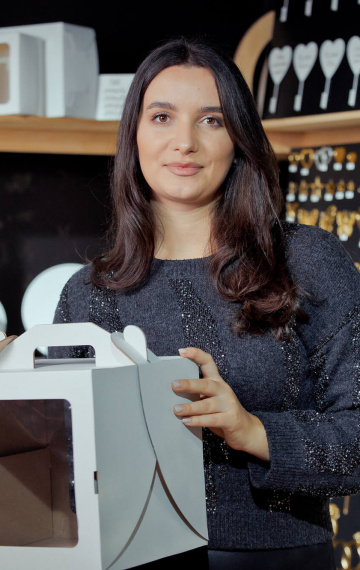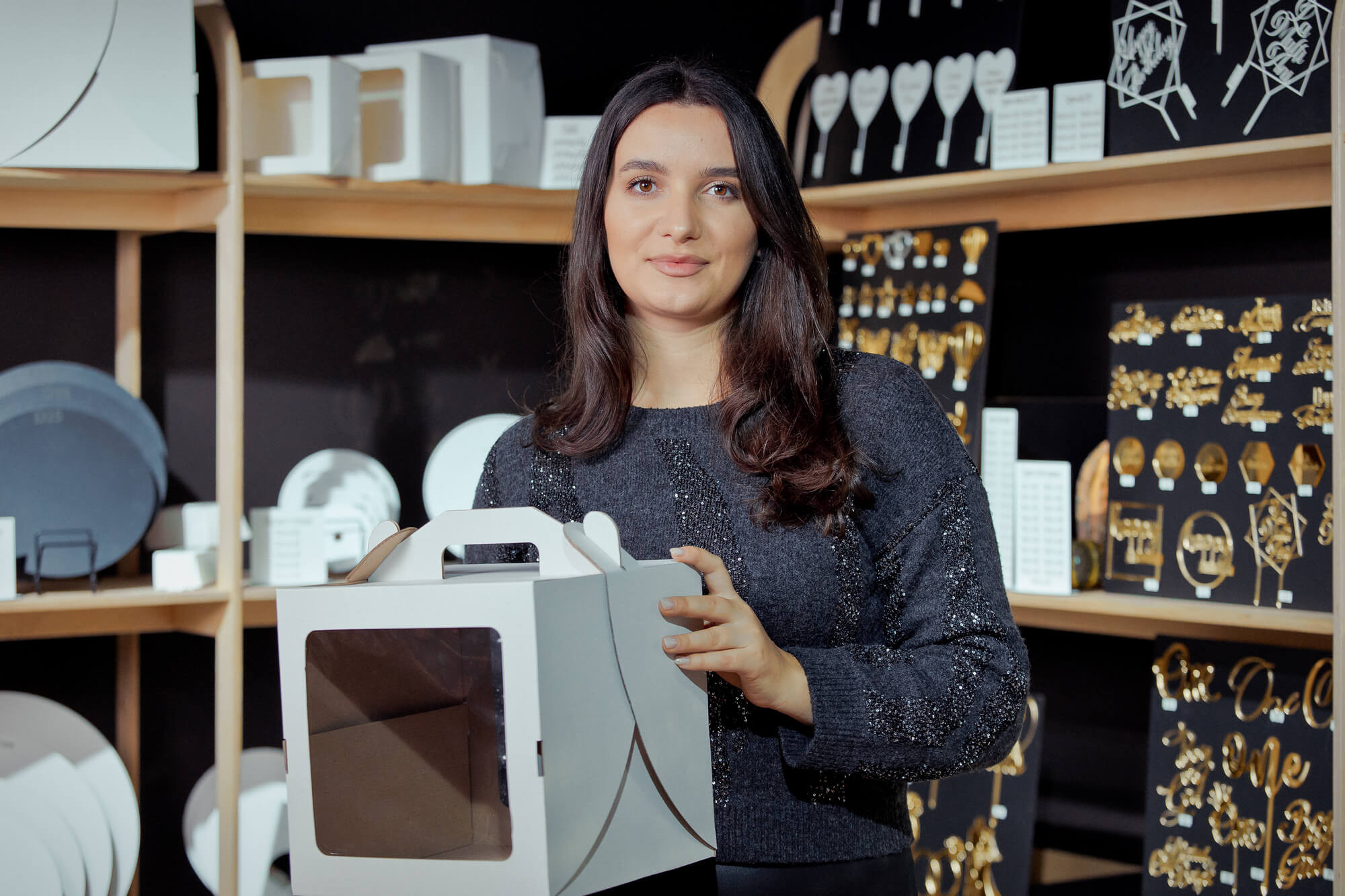 „Facem cutii personalizate pentru torturi și prăjituri. Cele mai solicitate sunt cele pentru torturi Bento, cutiile de 17x17 și 15x15. Avem și modele speciale pentru macarons. Dacă clientul are o cerință specifică, putem crea o ștanță nouă și un model unic”, explică Cătălina.